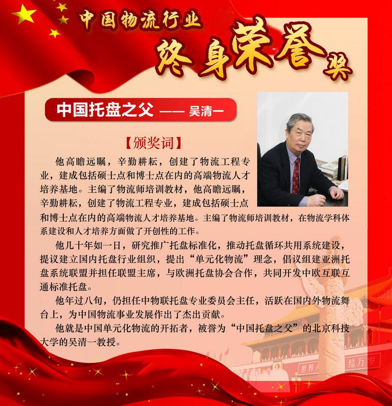 吳清一教授幾十年來為中國物流事業(yè)發(fā)展做出重大貢獻(xiàn),尤其在托盤物流領(lǐng)域取得了矚目的成就,經(jīng)中國物流與采購聯(lián)合會(huì)研究決定,授予吳清一教授“中國物流行業(yè)終身榮譽(yù)獎(jiǎng)”。